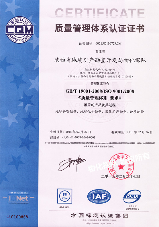 ? ?? ? 我隊于2015年2月27日獲得了方圓標(biāo)志認(rèn)證集團(tuán)有限公司認(rèn)可的質(zhì)量管理體系(換版認(rèn)證)〔GB/T19001-2008〕、環(huán)境管理體系〔GB/T24001-2004〕、職業(yè)健康安全管理體系〔GB/T28001-2001〕三大認(rèn)證證書。